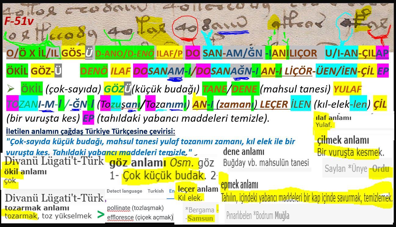 **“ÖKİL (çok sayıda) GÖZÜ (küçük dal) TANE / DENE (tahıl tanesi) YULAF TOZANI-M-I / -ĞN-I (TOZ-UŞAN-I'deki gibi bitkinin tozlaşmasına atıfta bulunur) AN-I (zaman) LEÇER İLEN (ince bir elekle) ÇİL (tek hamlede kesmek) EP (tahıldan yabancı parçacıkları temizlemek).”**