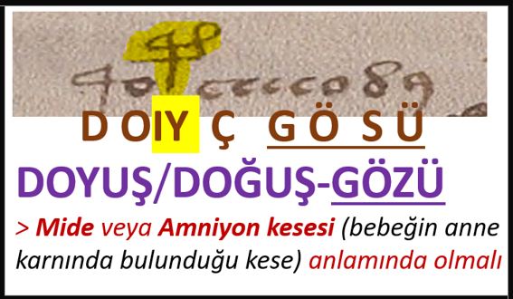 Yazarın DOIYIÇ/DOYIÇ GÖSÜ biçiminde yazdığı sözcükler fonetik değer yakınlığına göre "DOĞUŞ-GÖZÜ" (amniyon kesesi) veya "DOYUŞ GÖZÜ" (mide) anlamında olmalı. Kathi karar bu tümce ve tam sayfa çözümlemeleri yapılırken verilebilir.