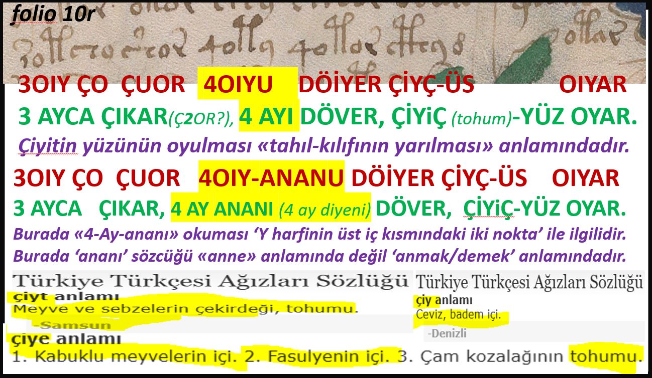 10r sayfasında alttan ikinci satır rasgele seçilen sayfadan seçilen rasgele iki satırdan birisi olarak okunmuştur. Yazar bir bitki çizimi yaptığı 10r sayfasında şu satırı yazmış: "3OIY ÇO ÇUOR 4OIYU DÖYER ÇİYÇ-ÜS OYAR". Fonetik değerce yakın sözcüklerle bu tümceyi yeniden oluştursak (öyle ki burada kullanılan / "bölme" işareti o veya bu anlamında olmakla) tümce şu fonetik biçimi alır: "3 AYCA ÇIKAR/CÜCER 4 AYI DÖVER/DAYAR ÇİYÇ-YÜZ OYAR". Bu ifade, tanıtılan (hakkında bilgiler yazılan) bitkinin 3 ayda çıktığı ve 4 aya yaklaşırken tohumların şişerek kılıfını yırttığı anlamındadır. 3 AYCA ÇIKAR 4 AYI DÖVER ÇİYÇ-YÜZ OYAR tümcesinde yine dikkat çeken bir unsur burada 3 ve 4 sayılarının tümce içinde rakam biçiminde yazılmış olmasıdır.