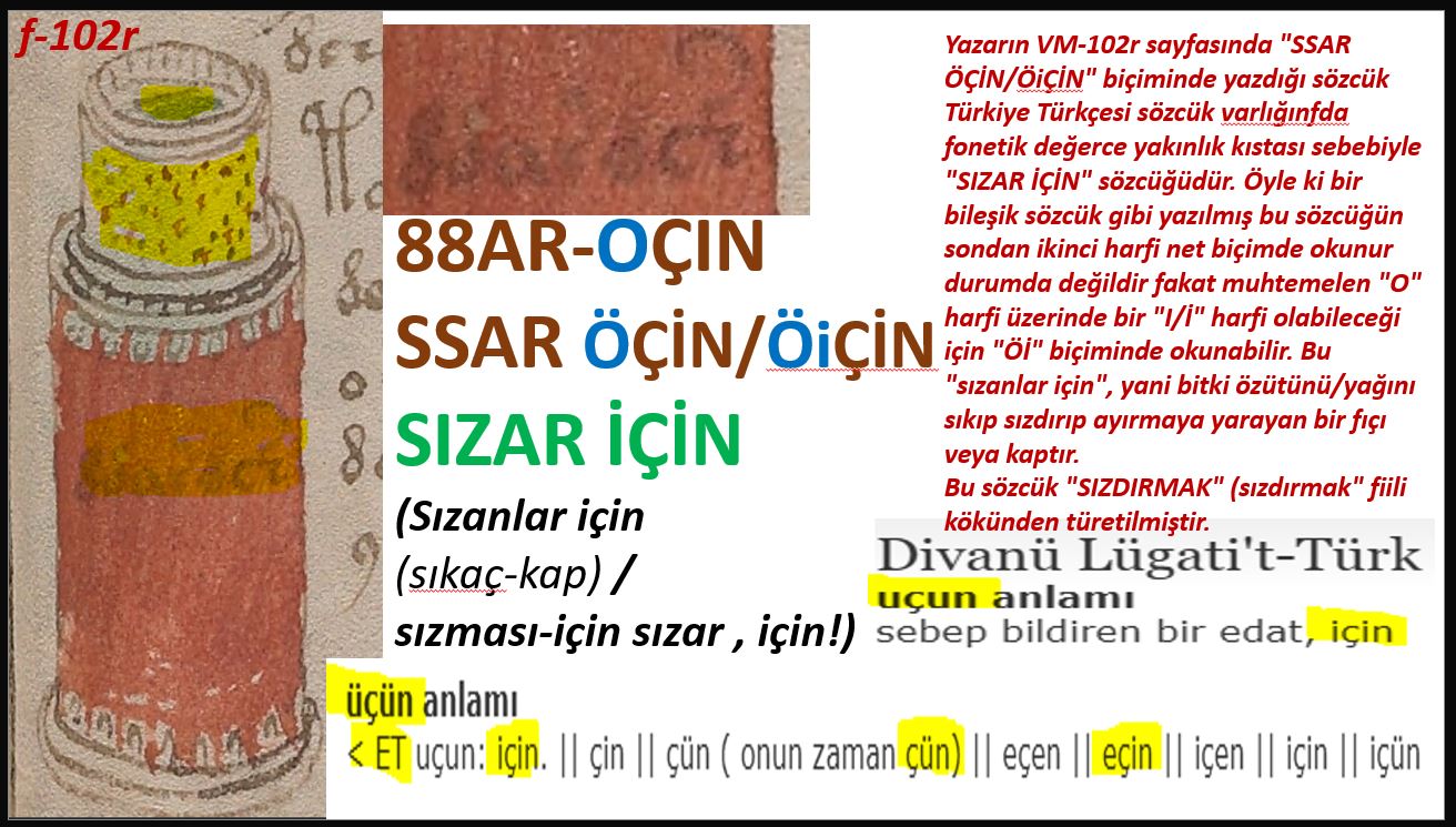 On folio VM-102r of the Voynich Manuscript, the author has written the word "SSAR ÖÇİN/ÖİÇİN". Which—based on phonetic proximity within the lexicon of modern Turkish—corresponds to the expression "SIZAR İÇİN" (“for those who extract” or “for those who press”). This word is derived from the verb root "SIZDIRMAK" (to leak). This compound-like word contains a penultimate character that is not clearly legible; however, it is plausible that an "I/İ" character appears above the "O", allowing the reading "Öİ".