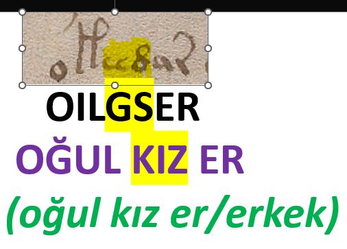 Yazar burada (103 v sayfasında) "OĞUL KIZ ER" sözcüklerini birleştirerek bitişik sözcük biçiminde yazmıştır. Yazar 240 sayfanın tamamında OĞUL sözcüğünü OIL kız sözcüğünü GS ve ER sözcüğünü ER biçiminde yazmaktadır. Başka sözcükler de aynı durumdadırlar. Yani aynı sözcüğü ATA alfabe transkripsiyonu tabanında farklı harflerle yazabilmektedir çünkü bu alfabe tamamı yaklaşık 300 adet üzeri harf içermektedir. Durum böyle olunca farklı harflerle yazılmış olsa da bunların okunuş biçimleri-fonetiği aynı olur. Mesela yazar OTACI yazacaksa bunu OTACI biçiminde veya sondaki C harfinin üstüne I harfi ekleyerek ve bu şekilde bunu hece harfi biçimine sokarak (fakat fonetik değeri değişmeden) aynı fonetikle aynı sözcükleri 240 sayfa boyunca yazmaktadır. İstisnalar birkaç tane olabilir ve bunlar muhtemelen devam eden okuma çalışmalarımızda tekrar bakılması gerekecek kısımları oluşturuyor olabilir.