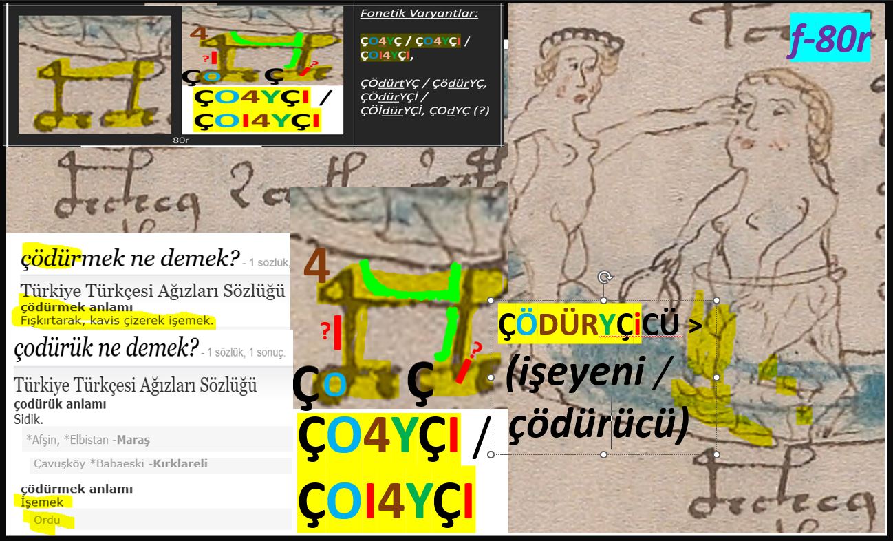 80r Sayfasında yapılan çizimlere bakıldığında bu sözcüğün bir dere benzeri su akıntısı içerisinde resmedilmiş kadın figürlerinden birisinin tam olarak ayağının altına gelen hizada yazıldığı görülür. Ve dikkatli olarak görsele bakılırsa burada su içinde ince ve belli belirsiz yatay çizgilerle dalgacıklar veya akıntı dalgası yaka kenarı benzeri çizgisel ifadeler bu kadın figürünün ayaklarını soktuğu su üstünde veya içinde betimlenmiş biçimde görülmektedir. Yazarın burada yazmış olduğu "ÇÖDÜRYÇiCÜ / ÇOYDURY-ÇICU" okunabilen sözcük fonetik değerce yakınlık bakımından günümüz Karadeniz yöresi ağızlarındaki ÇÖDÜRMEK (işemek) fiiline oldukça yakındır ve sözcük ekleri dikkate alındığında burada yazarın "ÇÖDÜRüY-CÜ" (işiyor olan / çödürücü) ya da ÇÖDÜRÜÇ-CÜ (sık sık işeyen veya çişini tutamayan kimse) ya da "ÇÖYDÜREN ÇOÇUĞU" anlamında bu sözcüğü yazmış olabileceği söylenebilir.
