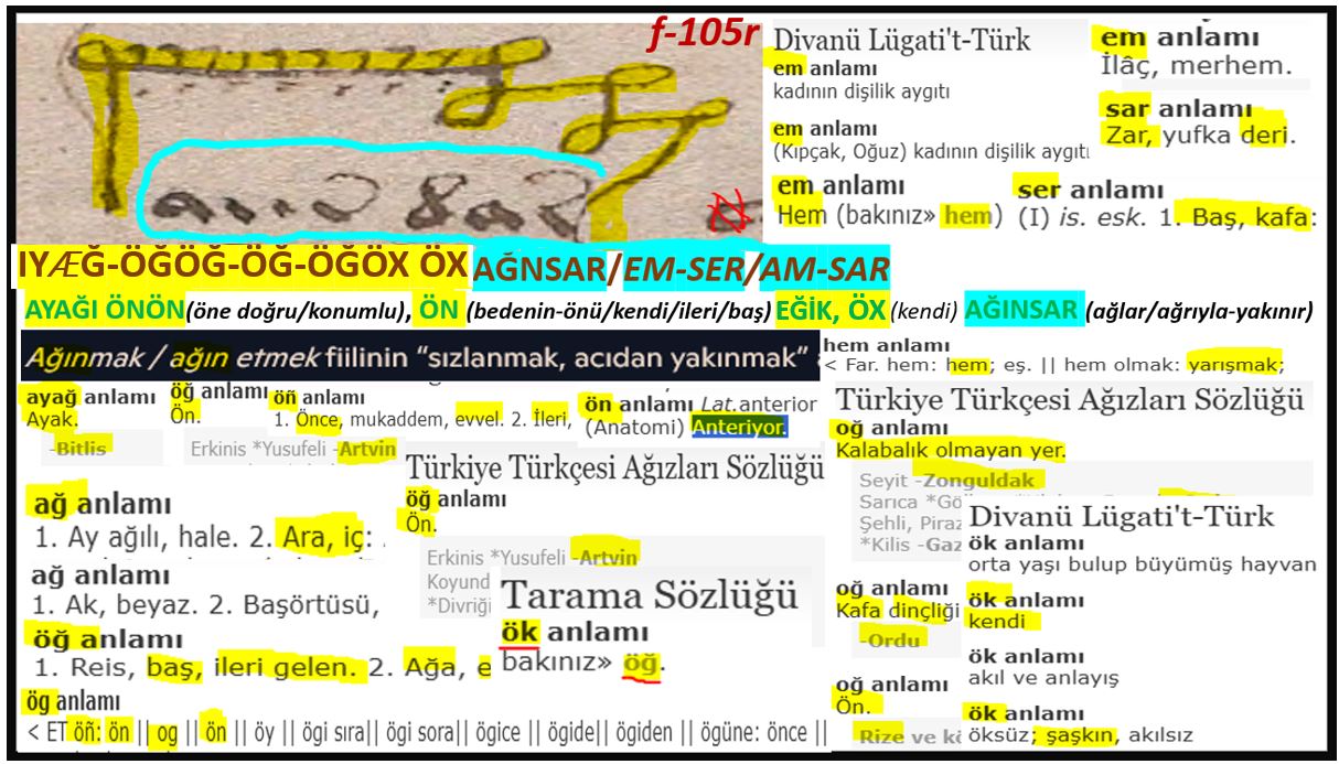 "AYAĞI ÖNÖN (öne doğru/öne-konumlu), ÖN (bedenin-önü/kendi/ileri/baş) EYİK, ÖX (kendi) AĞINSAR (ağlar/ağrıyla-yakınır)