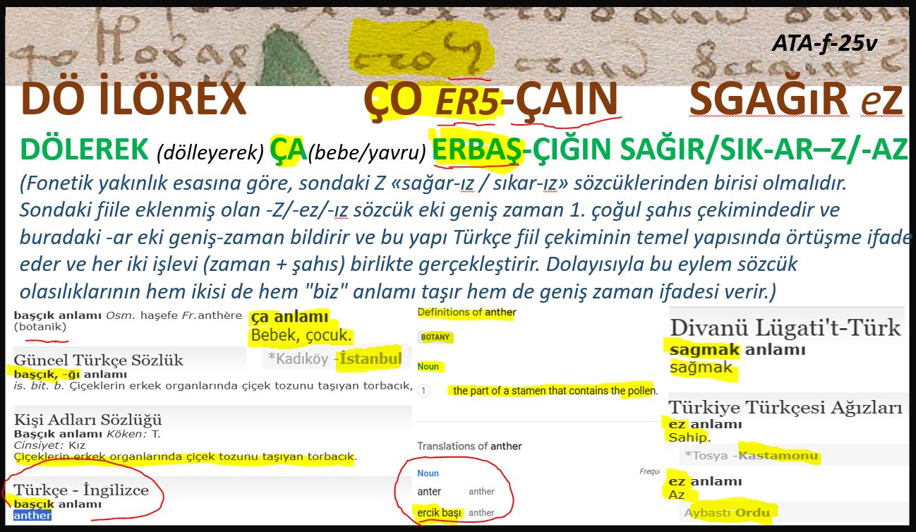 Açıklama: > ÇA sözcüğü Eski Türkçede (örneğin İstanbul ağzında) bebek ve çocuk anlamındadır. Yazarın ERBAŞÇIĞI ifadesi İngilizcesi "ANTHER" olan ve anlamca "çiçeklerin erkek organlarında çiçek tozunu taşıyan torbacık" biçiminde açıklanan isim sözcüktür. Bu Türkçe sözcük ve sözlüklerde güncel fonetik biçimi ile BAŞÇIK olarak geçer. Ayrıca google gibi çevrim içi bir sözlükte ANTHER sözcüğünün Türkçe olarak nasıl açıklandığına bakarsanız o açıklamada (öyle ki görselde bunu alıntılayıp ekledik) "ERCİK-BAŞI" açıklaması görülmektedir. Elbette burada kastedilen bu sözcüğün yazıldığı sayfada çizilen bitkinin tohumları taşıyan baş kısmı olmalıdır. Bu bağlamda bu sözcük aynı zamanda içerikteki çizimlerle örtüşen sözcüklerden birisi olarak tarafımızca not edilmiştir.