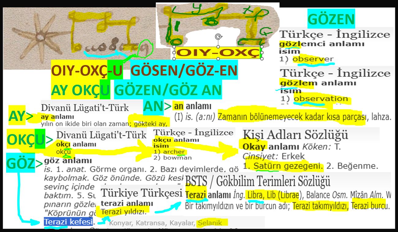 68 r sayfasında yan yana yazılmış gökcisimleri adları görmekteyiz ve bu muhtemelen bir yıldız kümesinin veya belli bir kök cisminin adını temsil ediyor olmalıdır. Öyle ki bu sözcük bir tümce içinde değildir bu sözcük bir yıldız çizimi yanında bileşik biçimde yazılmış birkaç ismin bitiştirilmiş halidir. Yazar burada; "OIY-OXÇ-U GÖSEN/GÖZ-EN" bileşik isim ifadesini yazmış. Bu ifadenin fonetik değerce yakını olan sözcükleri sözlüklerde bulabiliyoruz. Böylece bu özel adlandırmayı "AY OKÇU GÖZEN" biçiminde veya "AY OKÇU GÖZ AN" biçiminde yeniden yapılandırabilmekteyiz. Burada GÖZEN (gözlemleyen/gözleyen) sözcüğü kökü GÖZ sözcüğüdür. GÖZ sözcüğünün pek çok anlamı yanı sıra Türkçede bu sözcüğün "terazi-kefesi/terazi" (Libra/scale) anlamında kullanımı kaydedilmiştir. Türkçede "Terazi Takım Yıldızı" ve "Terazi" burç adları bilinmektedir. Ve bu biçim ile bu isim aynı anlamın yazarın ağzındaki eş anlamlısı olabilir. İlaveten, GÖZLEM (observation) sözcüğü ve GÖZLEMCİ (observer) sözcükleri de aynı kökten Türetilmiştir ve yazarın kullandığı fonetik değere oldukça da yakın sözcüklerdir. Bu özel adın kökü durumunda AY(Moon) +OKÇU (Archer) sözcükleri bulunur. Bunlar ayrı sözcüklerdir ve OK ve AY sözcükleri yer değiştirmiş biçimi (AY OKÇU yerine OKUÇU AY biçiminde) olan OKAY adı mevcuttur. OK+AY bileşik isim sözcüğü SATURN anlamına gelen Türkçe yıldız ve kişi adıdır. Sözcük sonundaki AN hecesi tek başına bulunduğunda "zamanın en küçük birimi" anlamındadır. Dolayısıyla burada sesli harmonisi ve semantik yapı gereği bunun GÖZ/GOZ sözcüğüne bitişmiş bir AN sözcüğü değil de ona sözcük eki olacak biçimde GÖZ-EN (gözlemleyen) anlamında kullanılmış olması daha olasıdır. Dolayısıyla buradaki yıldızın adı SATÜRN-Ü GÖZEN veya TERAZİ YILDIZINI GÖZEN anlamında olmalıdır. Bir yıldız elbette bir başka yıldızı izlemez. Fakat bu Türkçe semantik yapı içerisinde "Satürn ile ya da Terazi Yıldızı ile karşı karşıya / yüz-yüze olan" veya "Satürn veya Terazi yıldızının ardınca veya yanında ya da aynı istikamette hareket eden" anlamında olabilir. Her durumda bunu bir çizim sözcük örtüşmesi olarak kaydedebiliriz.